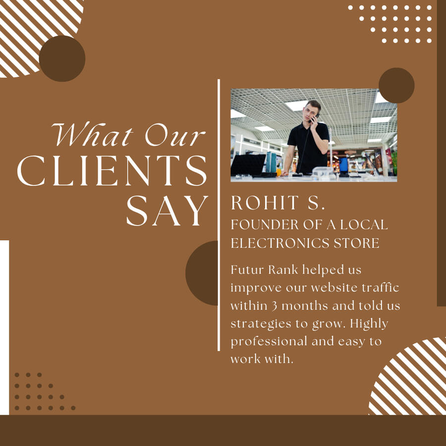"Futur Rank helped us improve our website traffic within 3 months and told us strategies to grow. Highly professional and easy to work with.” — Rohit S., Founder of a local electronics store"Finally found someone who doesn’t just talk — but delivers. The Google Ads campaign they ran brought in real leads at a genuine price.”